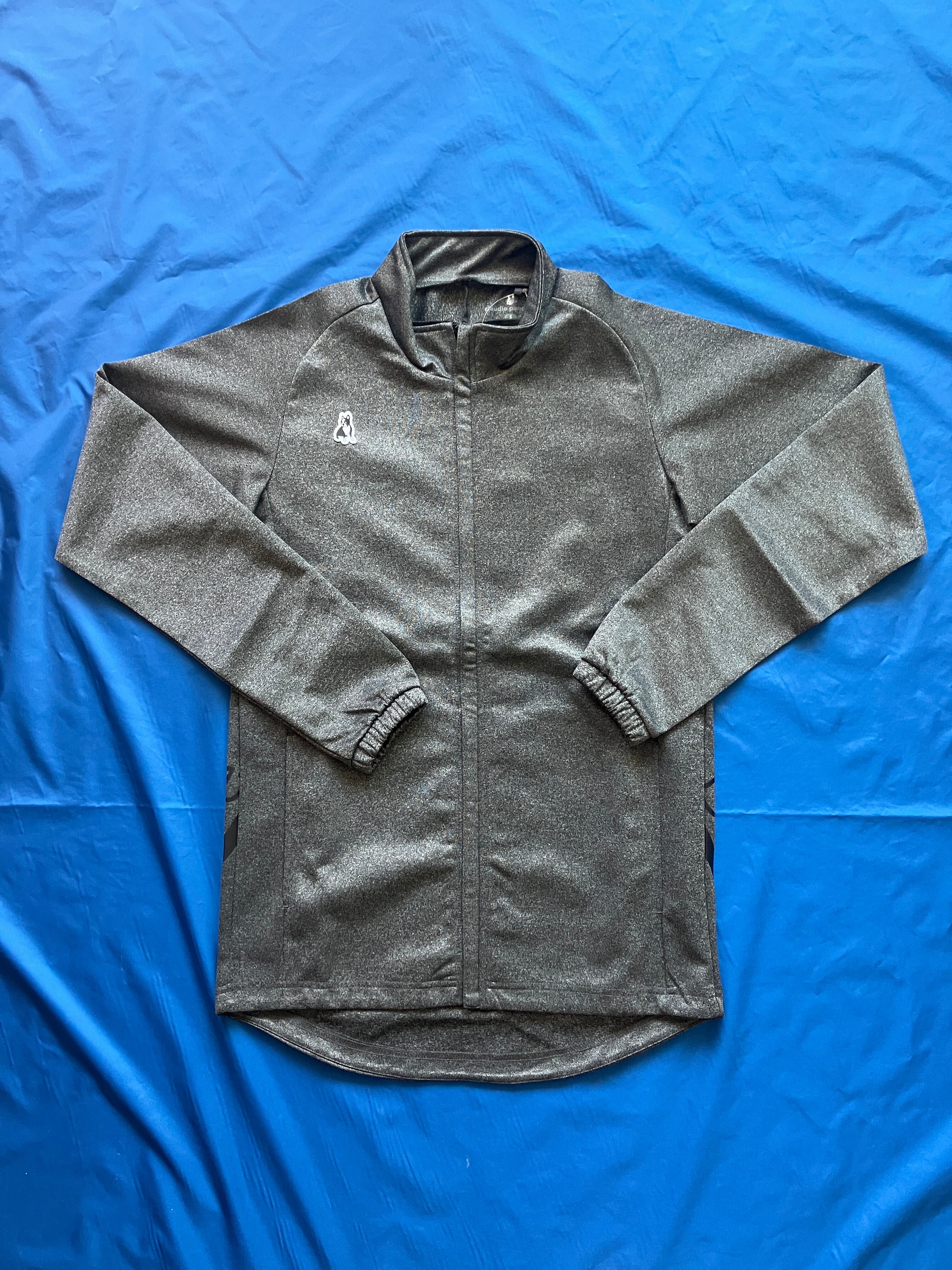 背面に大きくサークルロゴが入ったトレーニングジャケットです。 すっきりとしたシルエットでランドテール使用にもなっているので、お尻まで隠れます。 ※ランドテール=丈の腰部分が丸くなっている仕様。 生地も厚めなので一年を通して長く使えますね。 ヘザーブラック(150) ポリエステル92%、ポリウレタン8%